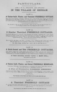 Lot 5 – a thatched freehold cottage of 4 rooms, with barns, large garden, and small orchard in the rear, let to John Boyton, at a rental of £4 11s per annum, desirably situate adjoining Lot 4, and abutting upon the Green. The fences on the west and north will be sold with this Lot. Sold to G. Hornsby for £58. Now known as ‘Lamberts’.