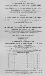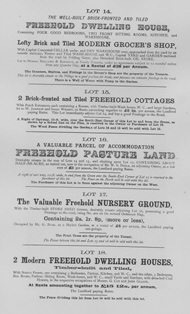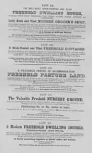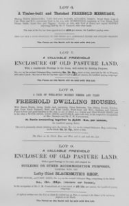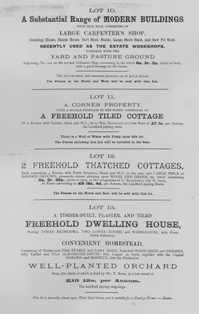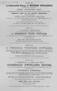 Dwelling House with a lofty grocers shop; a pair of semi-detached residences with gardens; a messuage with convenient farm homestead and hoppet, and an enclosure of pasture land; nursery grounds, pasture; 19 messuages and cottages with gardens, the whole producing £ 185 per annum; blacksmiths and builder’s workshops, with yard and pasture, in hand; also 21 parcels of common field land let at £ 10 per annum.