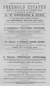 Lot 21 – a plot of freehold garden ground, suitable for building purposes, desirably situate at the south entrance to the village, with a frontage of about 100 feet to the Green, also a corner plot of garden ground near, with a frontage of about 65 feet to the road, both in the occupation of Mr. T. Wright, at a rental of £1 10s. per annum, the landlord paying rates. Sold for £30 to Mr. T. Wright. Now known as ‘Coopers Hall Cottage’ and ‘Heathfield’.