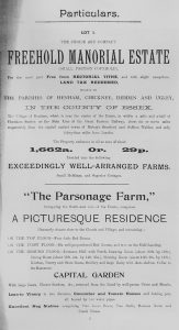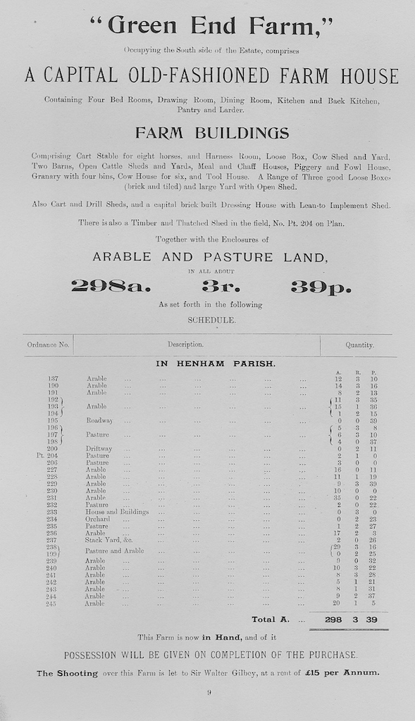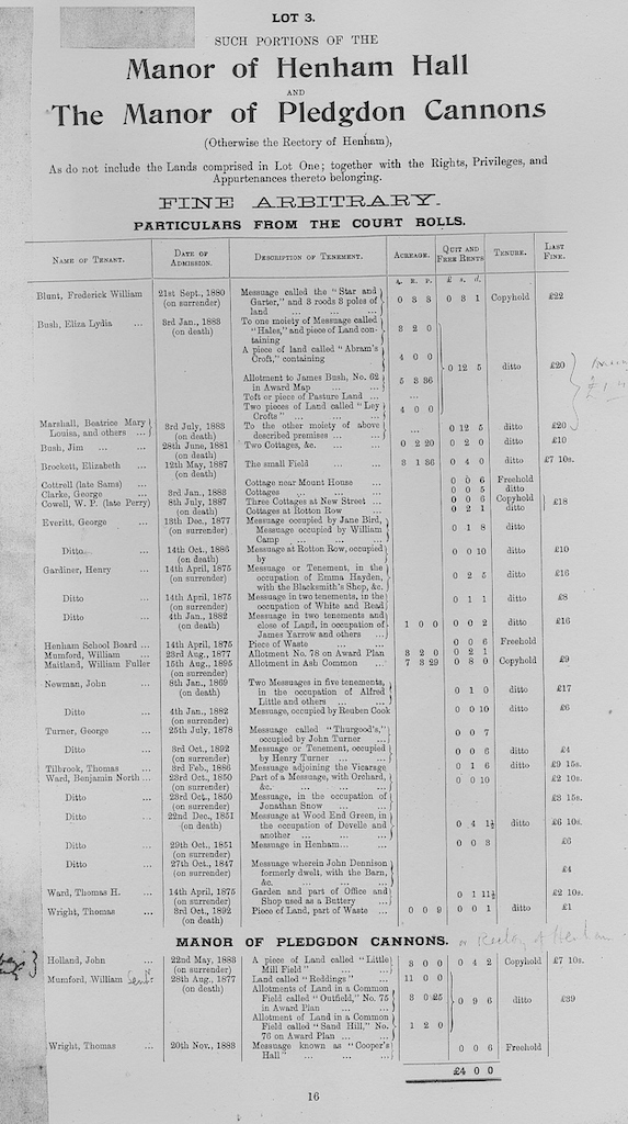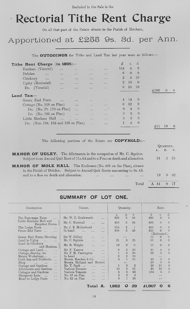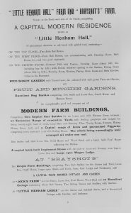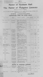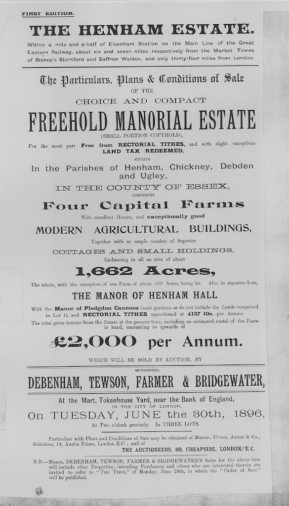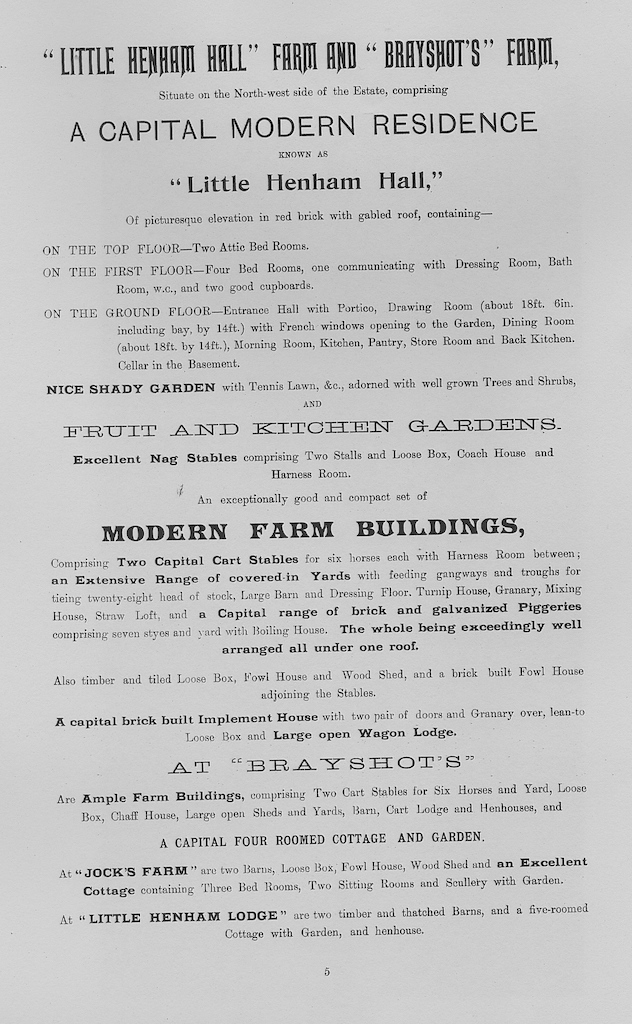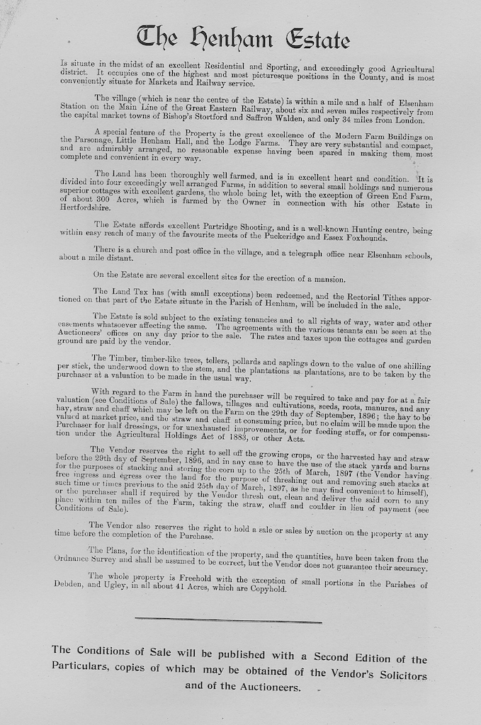 The following information is taken from a sale catalogue in Miss Joyce Winmill’s Collection. This auction included Parsonage Farm, Cock Public House, Little Henham Hall, Brayshott’s Farm, Jock’s Farm, Lodge Farm & Green End Farm.