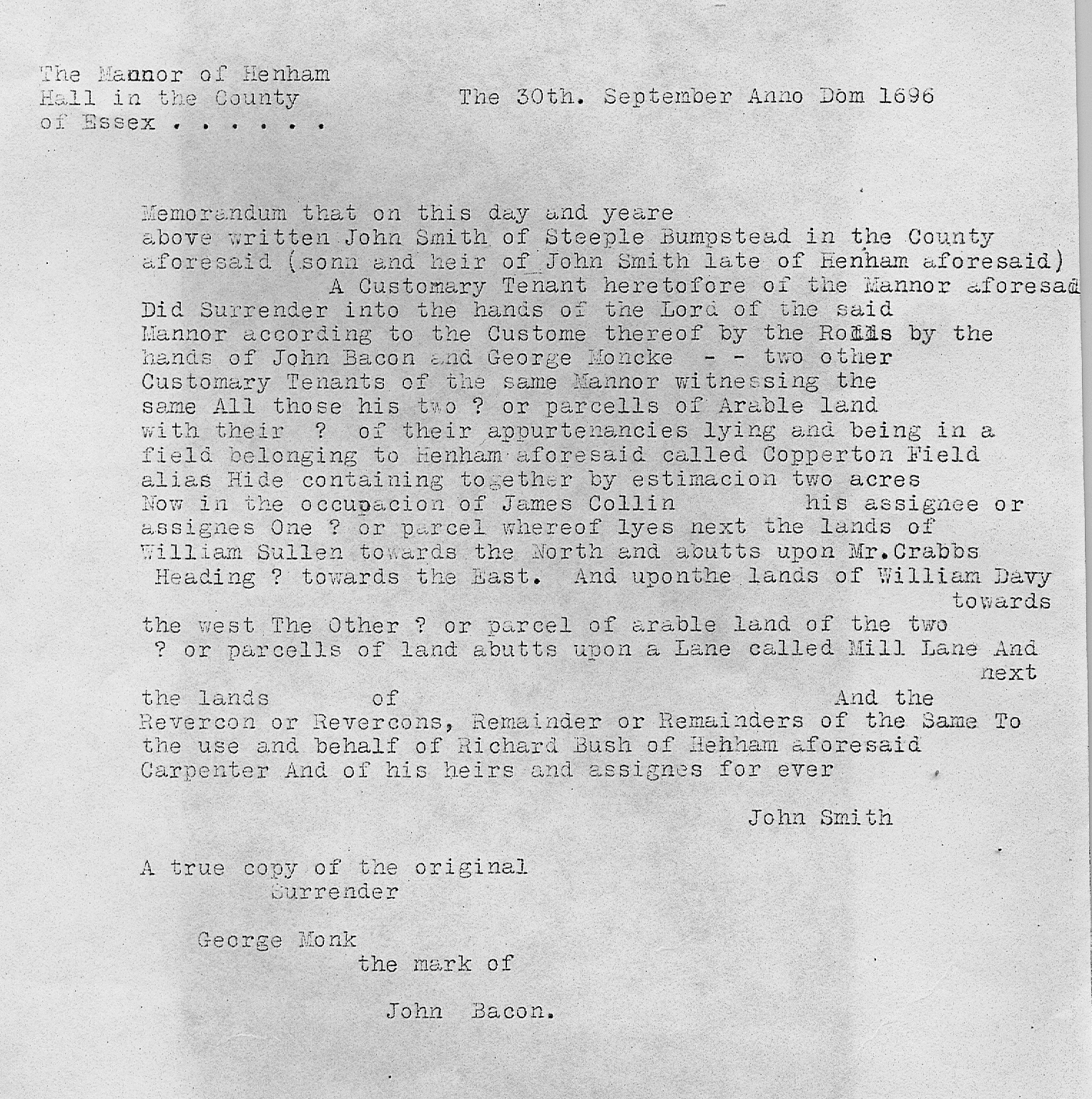 The Manor of Henham Hall in the County of Essex. The 30th September Anno Dom 1696 Memorandum that on this day and yeare above written John Smith of Steeple Bumpstead in the County aforesaid (son and heir of John Smith late of Henham aforesaid) Did surrender into the hands of the Lord of the said Manor according to the customs thereof by the Rolls by the hands of John Bacon and George Moncke.. two other Customary Tenants of the same manor witnessing the same All those his two (?) or parcels of arable land with their (?) appurtenances lying and being in a field belonging to Henham aforesaid called Copperton Field alias Hide containing together by estimation two acres Now in the occupation of James Collin …. his assignee or assignes One (?) or parcel whereof lyes next the lands of William Sullen towards the north and abutts upon Mr. Crabbs heading (?) towards the east. And upon the lands of William Davy towards the west. The other (?) or parcel of arable land of the two (?) or parcels of land abutts upon a lane called Mill Lane and next the lands of Reversion or Reversions, Remainder or Remainders of and the same to Carpenter and of his heirs and assignes for ever. Signed: John SmithA true copy of the original Surrender Signed: George Monk and the mark of John Bacon5. 1707 21st Aug Will of Dame Anne Wright proved 24th Mar 1708/9To Samuel Smith, vicar of Henham, for life a customary messuage called Pinchthorpe and land (50 acres ), lately purchased of John Wooley, now in tenure of John Wright, and copyhold of manor of Henham Hall, in Henham, provided that he remain vicar there, executors paying his fine on admission, and then to his successor incumbents, they paying the fine….. To Elizabeth Acton copyhold messuage and lands, purchased of William Davy, in tenure of Simon Franklin, in Henham, copyhold land purchased of Simon Archer, held by Mr Squire, both amounting to c. £ 20 a year, for life and then to grandson Henry Pye and his heirs, and also £ 1006. 24th March 1715/16 Release (office copy c. 1740) for £ 400