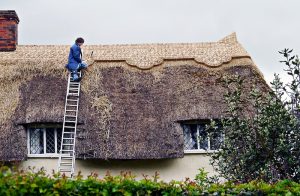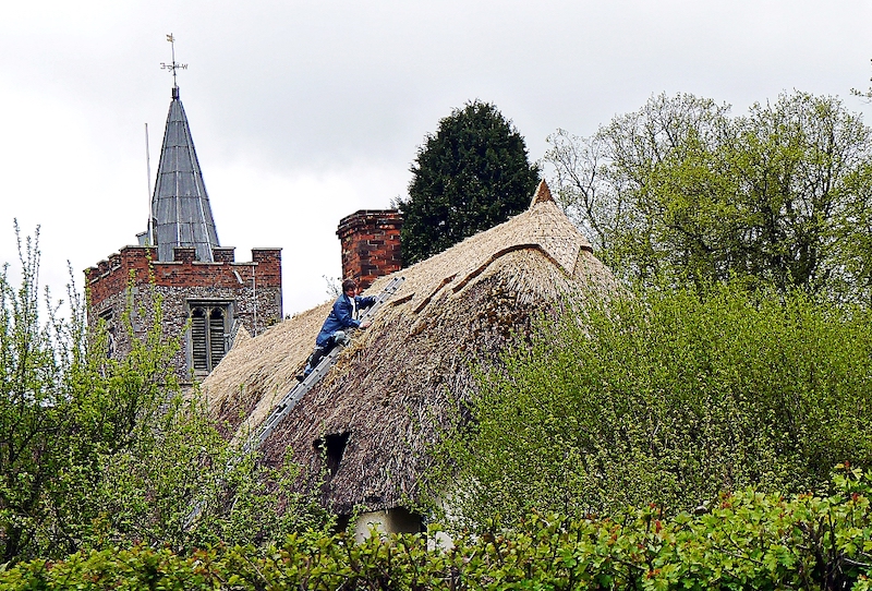 | Friars Cottage, CHURCH END - C17 timber-framed and plastered house. Restored. One storey and attics. Small casement windows with lattice leaded lights. Roof thatched, with 2 dormers and an original central chimney stack with 2 octagonal shafts. Friars Cottage being re-thatched April 2017 ![]() ![]() ![]() |