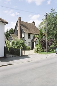| Orchard Cottage, WOODEND GREEN - timber-framed and plastered building with Cl8-C19 external features. Two storeys. Casement windows with glazing bars. A gabled porch projects on the front. Roof tiled, with a central chimney stack and one gabled dormer on the front. At the rear there is a weather-boarded addition with a lean-to roof. | ![]() |
