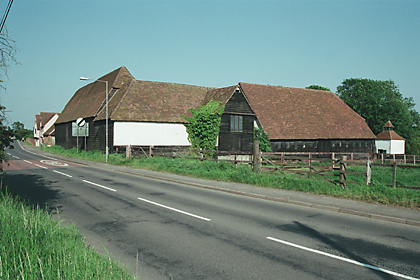| Pledgdon Hall Barn - Large C17 timber-framed and weather-boarded barn on the west side of the yard, just south of the hall, with an entrance bay on the east side. Roof tiled, half hipped at the south end and on the entrance bay. | ![]() |
