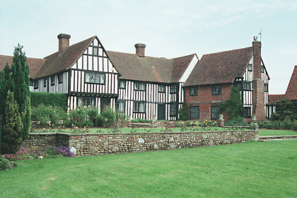 | Greenend Farmhouse, 4725 - WOODEND GREEN - Late C16 1567AD to 1599AD Post Medieval timber-framed and plastered house. One storey and attics. A gabled wing extends on the east side and a modern addition on the west side. The windows are C20 casements with glazing bars. Roof tiled, half hipped at the north and south ends, with an original central chimney stack with 4 diagonal shafts. There are 3 gabled dormers on the west side and 2 on the east. The interior has good panelling dated 1589 and an original plaster fireplace ornamented with Tudor roses and fleur-de-lis. | ![]() |