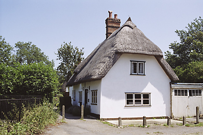 | Ham Cottage, WOODEND GREEN - small C18-C19 timber-framed and plastered building. One storey. Small casement windows. Roof thatched. There is a modern addition at the south end. | ![]() |