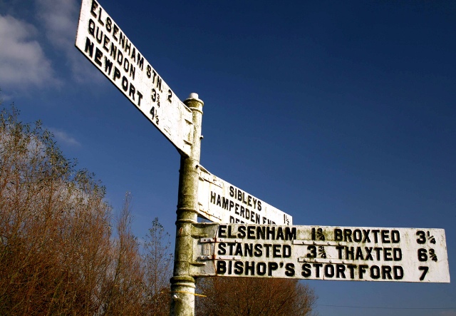 | Signpost at Henham Mill Road B1051 junction of road to Brick End 40820. Signpost. 1920s/1930s. Cast iron. Manufactured by Maldon Iron Works. A circular section tapered post with flat semicircular parish plate finial reading PARISH OF / HENHAM with E.C.C. / STICK NO BILLS in centre. Two rectangular 10½ inch arms reading ELSENHAM 1½ STANSTED 3½ / BISHOP’S STORTFORD 7 B1051 (2) BROXTED 1¼ THAXTED 5 / HAVERHILL 18¼ B1951 and 7-inch arm reading PLEDGEON GREEN ¼ / BRICK END 1¼. Part of Maldon Iron Works Order No.2404 dated 6/2/1933 for District 1 of Essex County Council. | ![]() |