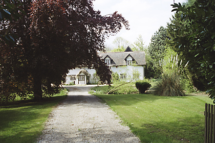 | Pledgdon Hall, HENHAM ROAD - Timber-framed and plastered house, probably originally a mediaeval hall house on a moated site. Altered and extended in the C17 and later. Renovated in the C20. At the west end there is a cross wing with a jettied upper storey. The centre part has 2 small gables and the east end projects on the front, with a catslide roof and a gabled dormer. The windows are iron casements with glazing bars, probably an early example of Crittalls manufacture. Roof tiled. At the west end there is a large external end chimney stack and the centre block has a central rectangular stack. The interior has heavy close studding exposed at the west end. Pledgdon Hall Moat at Pledgdon Hall - three sides of a former moat extends to the north of the house and the house is built on the site of the south arm. | ![]() |