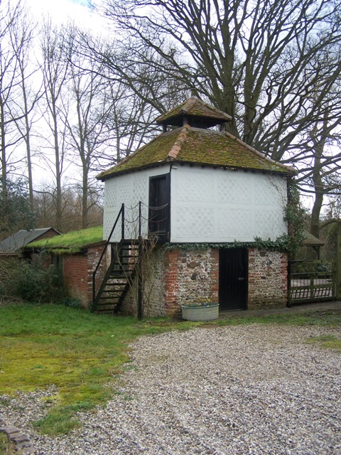 | Pennington Hall Dovecote, HENHAM ROAD - Good example of a C17-C18 dovecote, similar in shape to the dovecote at nearby Elsenham Place. Square on plan. Two storeys. The ground storey is of flint and brick and the upper storey is timber-framed and mainly plastered with modern pargetted panels on the front. The west side is weather-boarded. Roof tiled, pyramidal, with an open cupola with a small pyramidal tiled roof. | ![]() |