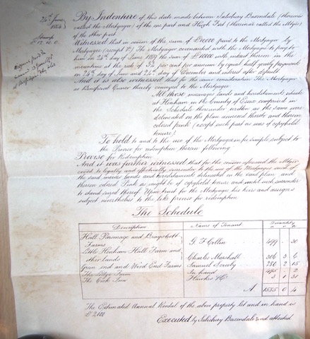 Prompt Corner 01 – Dated 24th June 1884. An Indenture of this date made between Salisbury Baxendale (thereinafter called the Mortgager) of the one part and Hugh Fort (thereinafter called the Mortgagee of the other part). Witnessed that in consideration of the sum of £10,000 paid to be Mortgager by Mortgagee (receipt ..) The Mortgager covenanted with the Mortgagee to pay to him on 24th June 1889 the sum of £10,000 with interest thereon in the meantime at the rate of 3 3/4 per cent per annum by equal half yearly payments on 24th June and 24th day of December and interest after default. And it is also witnessed that for the same consideration The Mortgager as Beneficial Owner thereby conveyed to the Mortgagee All those messuages, lands and hereditaments situate at Henham in the County of Essex comprised in the Schedule thereunder written as the same were delineated on the plan annexed thereto and thereon coloured pink (except such part as was of copyhold tenure). To hold to and to the use of the Mortgagee in fee simple subject to the Proviso for redemption therein following. Proviso for Redemption – And it was further witnessed that for the consideration aforesaid the Mortgager could to legally and effectually surrender to the use of the Mortgagee such of the said messuages, lands and hereditaments delineated on the said plan and thereon coloured Pink as might be of copyhold tenure and until such surrender to stand seized thereof Upon trust for the Mortgagee, his heirs and assigns subject nevertheless to the like proviso for redemption.