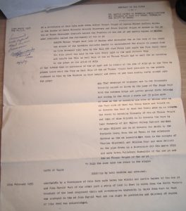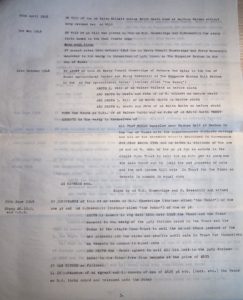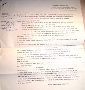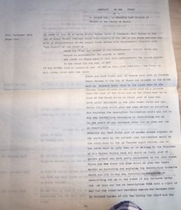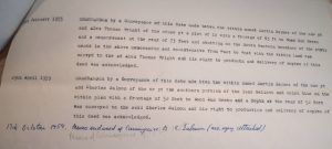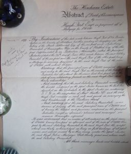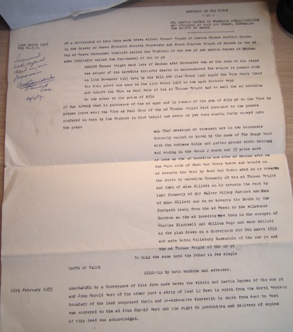 Prompt Corner 18 – 12th April 1927. Abstract of Title of Mr. Martin Baynes to freehold dwelling houses and premises at Wood End Green, Henham in the County of Essex. By a Conveyance of this date made between Alfred Ernest Wright of Museum Street, Saffron Walden in the County of Essex, Friendly Society Secretary, and Frank Charles Wright of Henham in the aforesaid County of Essex, shoemaker, who at the date of his death was seised of the hereditaments thereinafter .. in unincumbered fee simple in possession died on 11th Nov 1915 have by his Will dated 21st Feb. 1901 … who duly proved the same on the 14th Feb. 1916 in the .. probate registry. …Thomas Wright agreed to sell the aforesaid hereditaments to the purchaser at the price of £250. … All that messuage or tenement now in two tenements formerly called or known by the name of The Boggs together with the outhouses, buildings and garden ground thereto belonging and containing in the whole 2 roods and 33 poles more or less as the … hereditaments are situated at Henham aforesaid on the east side of Wood End Green there and bounded on or towards the west by Wood End Green aforesaid on or towards the north by hereditaments formerly of the said Thomas Wright and then of Miss Elliott on or towards the east by land formerly of Sir Walter Gilbey, baronet, and then of Miss Elliott and on or towards the south by the footpath leading from the aforesaid Green to the allotment gardens as the aforesaid hereditaments were then in the occupation of Charles Blackwell and William Sage and were delineated on the plan drawn on a conveyance dated 8th March 1899 and made between Salisbury Baxendale of the one part and the aforesaid Thomas Wright of the other part. To hold the same unto the purchaser in fee simple. 18th Feb. 1955. Memorandum by a conveyance of this date made between the within named Martin Baynes of the one part and John Harold West of the other part a strip of land 12 feet in width from the north western boundary of the land comprised therein and co-extensive therewith in depth from east to west was conveyed to the aforesaid John Harold West and his right to production and delivery of copies of this deed was acknowledged.