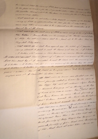 Prompt Corner 29 – (in continuation of above at 26) – several closes, pieces or parcels of land aforesaid held and occupied therewith situate at Henham in the County of Essex as the same were then late in the tenure or occupation of James Bush and his undertenants and then in the occupation of George Bush or his undertenants. And also all that cottage or tenement with the garden and appurtenances thereto belonging also situate at Henham aforesaid and then in the occupation of William Brand. All which said messuage, cottage or tenements, closes, pieces or parcels of land and hereditaments as the same were then tenanted, called and known were more particularly described and contained the several quantities more or less in the 1st. division of the 1st. Schedule thereunder written and the same were also delineated and described on the map or plan drawn on the last skin of now abstracting presents and were therein coloured blue. … To the use of the said J. D. Taylor and his heirs during the life of the said Joseph Baxendale in trust for him and his assigns….