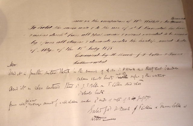 Prompt Corner 10 – By Indenture of the date between Henry Brook of Hatfield (?) in the county of Essex, gentleman, of the first part Joseph Thomas Collin and James Collin both of Saffron Walden both of the second part and Salisbury Baxendale of Bonnington, Ware in the county of Hertford of the third part. Reciting by an indenture dated the 13th July 1878 and expressed to be made between the said Henry Brook of the one part and the said J. T. Collin and J. Collin of the other part in consideration of the sum of £151 paid by the said J.T. Collin and J. Collin to said H. Brook the freehold premises thereby .. were conveyed by the said H. Brook unto the use of the said J.T. Collin and J. Collin, their heirs and assigns subject to a proviso for the redemption thereof ….