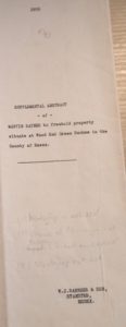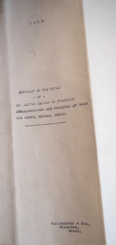 Prompt Corner 20 – 1959. Title page of an Abstract of The Title of Mr. Martin Baynes to freehold dwelling houses and premises at Wood End Green, Henham, Essex