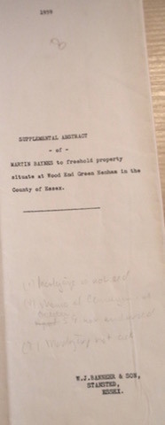 Prompt Corner 13 – 1959. title page to Supplemental Abstract of Martin Baynes to freehold property situate at Wood End Green, Henham in the County of Essex.