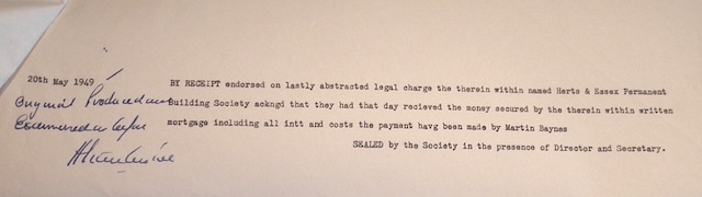 Prompt Corner 15 – 20th May 1949. By receipt endorsed … that The Herts & Essex Permanent Building Society had that day received the money secured by the therein within written mortgage including all interest and costs the payment having been made by Martin Baynes.