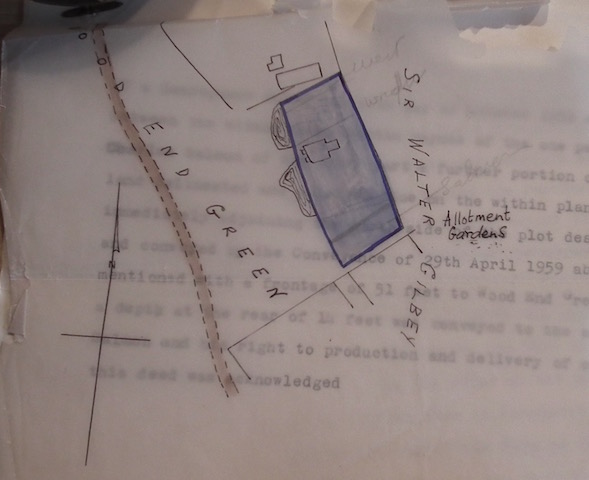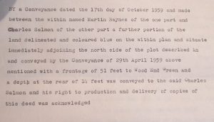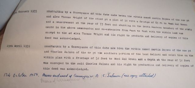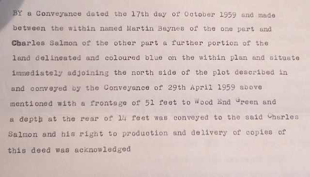 Prompt Corner 19 – 29th April 1959. Memorandum by a conveyance of this date made between the within named Martin Baynes of the one part and Charles Salmon of the other part the southern portion of the land delineated and coloured blue on the within plan with a frontage of 52 feet to Wood End Green and a depth at the rear of 52 feet was conveyed to the said Charles Salmon and his right to production and delivery of copies of this deed was acknowledged.