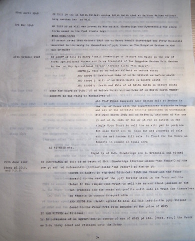 Prompt Corner 22 – 22nd April 1948 On this date the said Edith Willett otherwise Edith Smith died at Saffron Walden without having revoked her said Will. 3rd May 1948 said Will was proved by the aforesaid H.R. Shoebridge and P. Greenhill the executors therein named in the Principal Probate Registry. By assent dated 16th Oct. 1948 the aforesaid Harry Ronald Shoebridge and Percy Greenhill assented to the vestg. in themselves of property known as The Bungalow, Henham in the County of Essex. 16th Oct. 1948 – By assent of this date Harry Ronald Shoebridge of Patmore End, Ugley in the County of Essex, agricultural worker and Percy Greenhill of The Bungalow, Henham Halt, Henham in the said County, agricultural worker (thereinafter called ‘the executors’) … all that freehold bungalow near Henham halt… described in conveyance dated 22nd March 1924 and made between A. Atkinson of the one part and aforesaid W. Smith of the other part for an estate in fee simple upon trust to sell the same with power to postpone the sale thereof and to hold the net proceeds of sale and the net income till sale In trust for the executors as tenants in common in equal share. 29th June 1949 – H.R. Shoebridge thereinafter ‘the vendor’ and P. Greenhill ‘the purchaser’, the vendor agreeing to sell all his interest in the property at the price of £625. The Schedule includes: 28th Dec. 1933, the probate of the Will of Walter Smith otherwise Walter Willett otherwise Charles Willett; 31st May 1948: probate of the Will of Edith Smith otherwise Edith Willett.