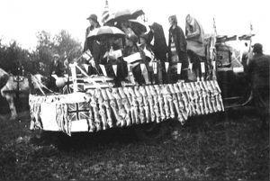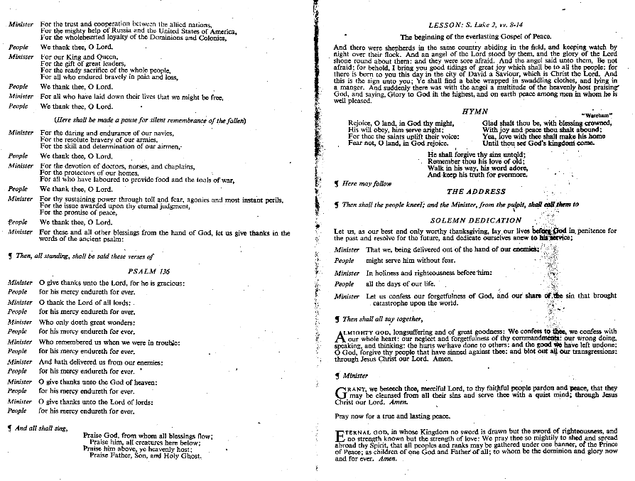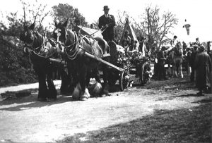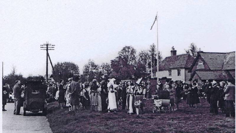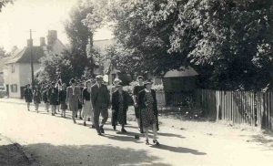 In 1945 there was a celebration of Victory in Europe (VE) day. One of the people who attended this service was Robert Napier who sadly lost his life a few weeks later whilst serving in the Pacific Ocean. The parade is being led by Mrs. Wellington, head of the first-aid group.